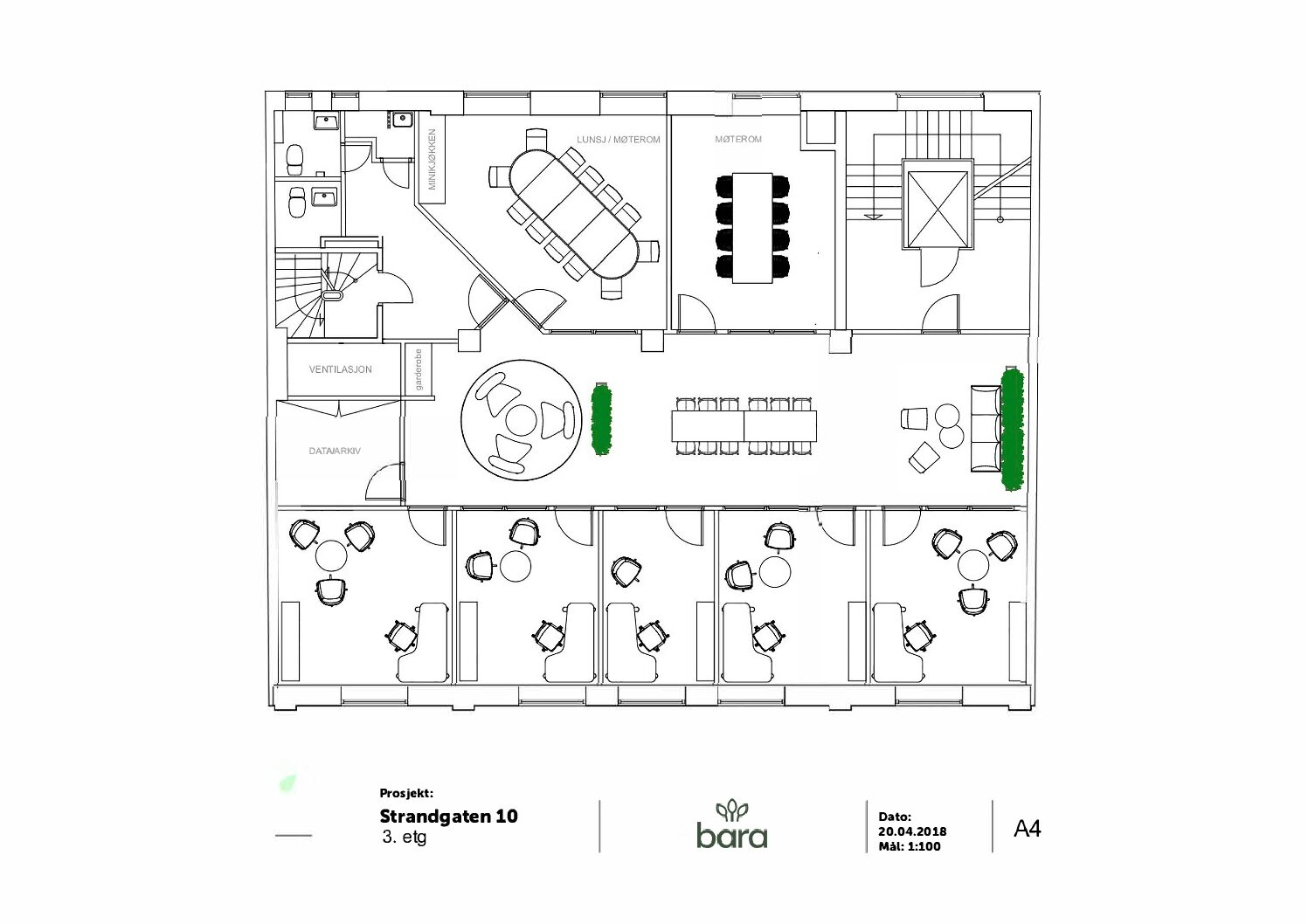 Store vinduer ut mot Strandgaten og mot bakgård gir lokalet et fint gjennomlys og god utsikt. Dagens løsning består av fem kontorer, kjøkken og møterom.