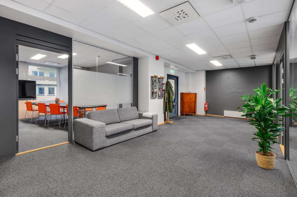 Lokalet ble oppgradert i 2018 og fremstår som moderne med god standard. Det er teppeflis i alle rom, bortsett fra på kjøkken der det er 3-stavs eikeparkett.